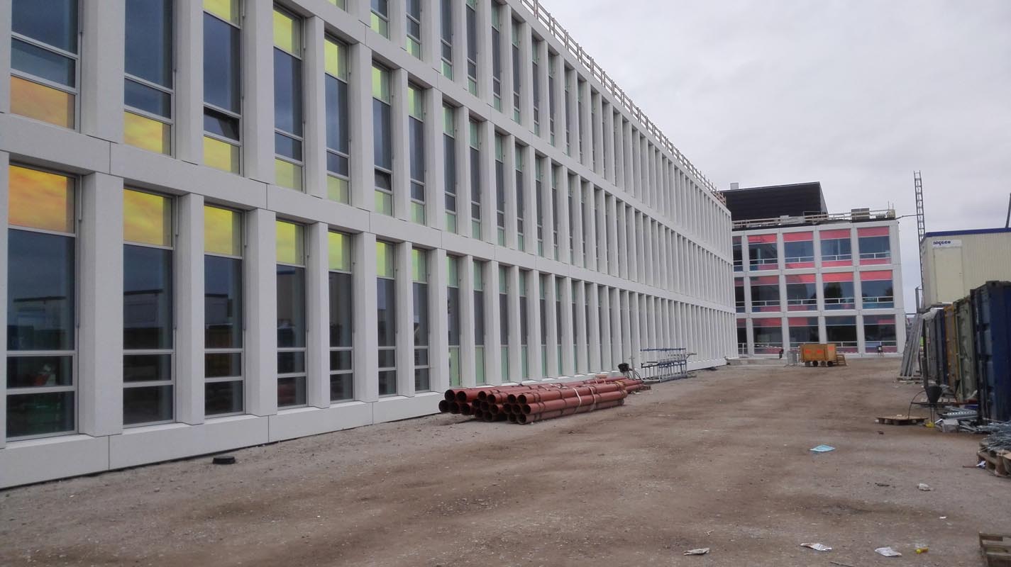 Afgezien van de kleuren lijkt het gebouw van buiten erg op het huidige TNW gebouw aan de Lorentzweg. Ook de gevel van het nieuwe gebouw bestaat uit niet-dragende betonelementen. De gebruikte gevelbekleding bevat beton, graniet en een witte kleurstof. Na uitharding worden de elementen gestraald voor een ruwere uitstraling.