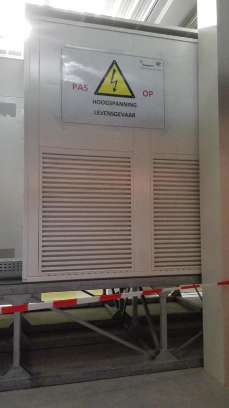 Rechts in het wit twee van de in totaal vier hoogspanningstranformators, bijna 3 meter hoog.