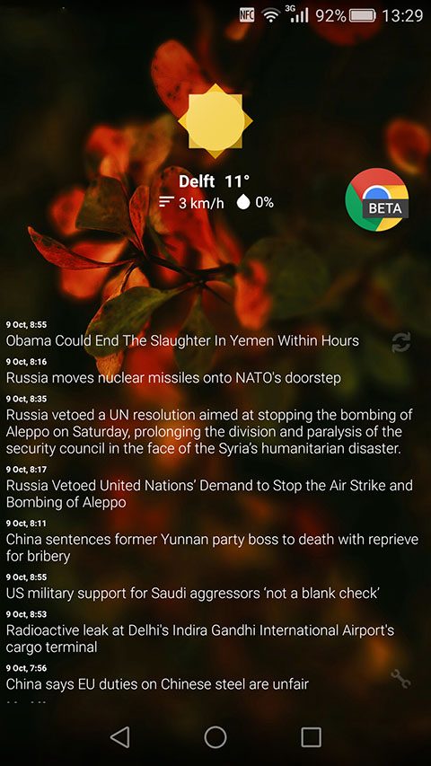 | Widgets | UCCW (custom clock) [Google Play] Big News (discontinued?) [Google Play] |